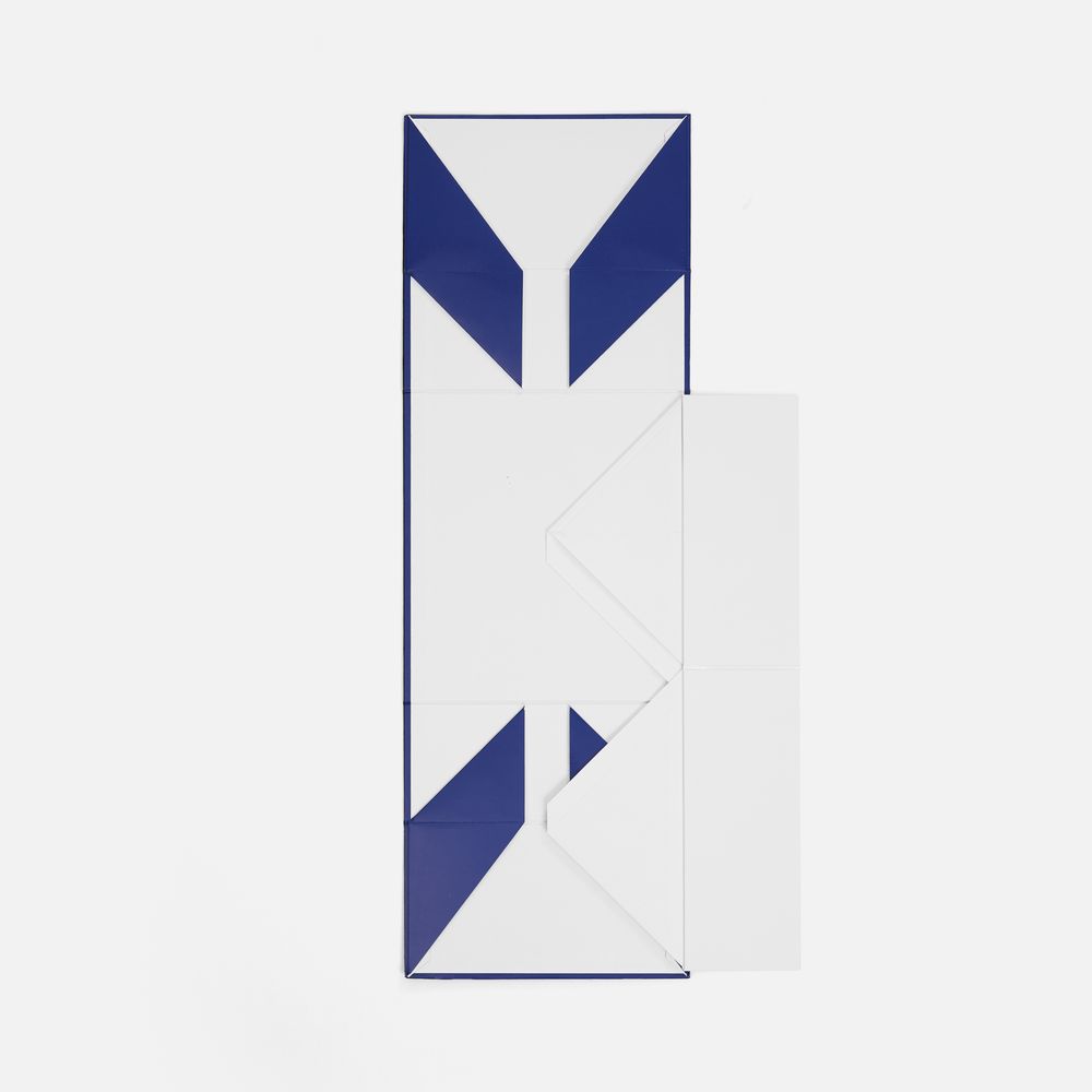 Коробка из переплетного картона 2 мм с оригинальной конструкцией: две симметричные створки открываются, создавая эффектную презентацию содержимого. Складная система на предустановленный двусторонний скотч делает сборку коробки быстрой и интуитивно понятной.