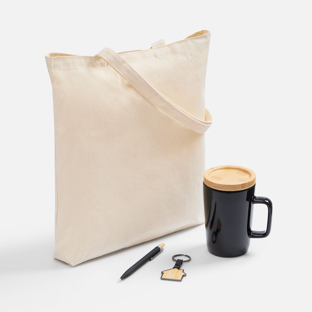 кружка - керамика, крышка - бамбук; сумка - хлопок 100%, плотность 210 г/м²; саржа; брелок - бамбук, металл; ручка - металл, алюминий; кнопка - бамбук